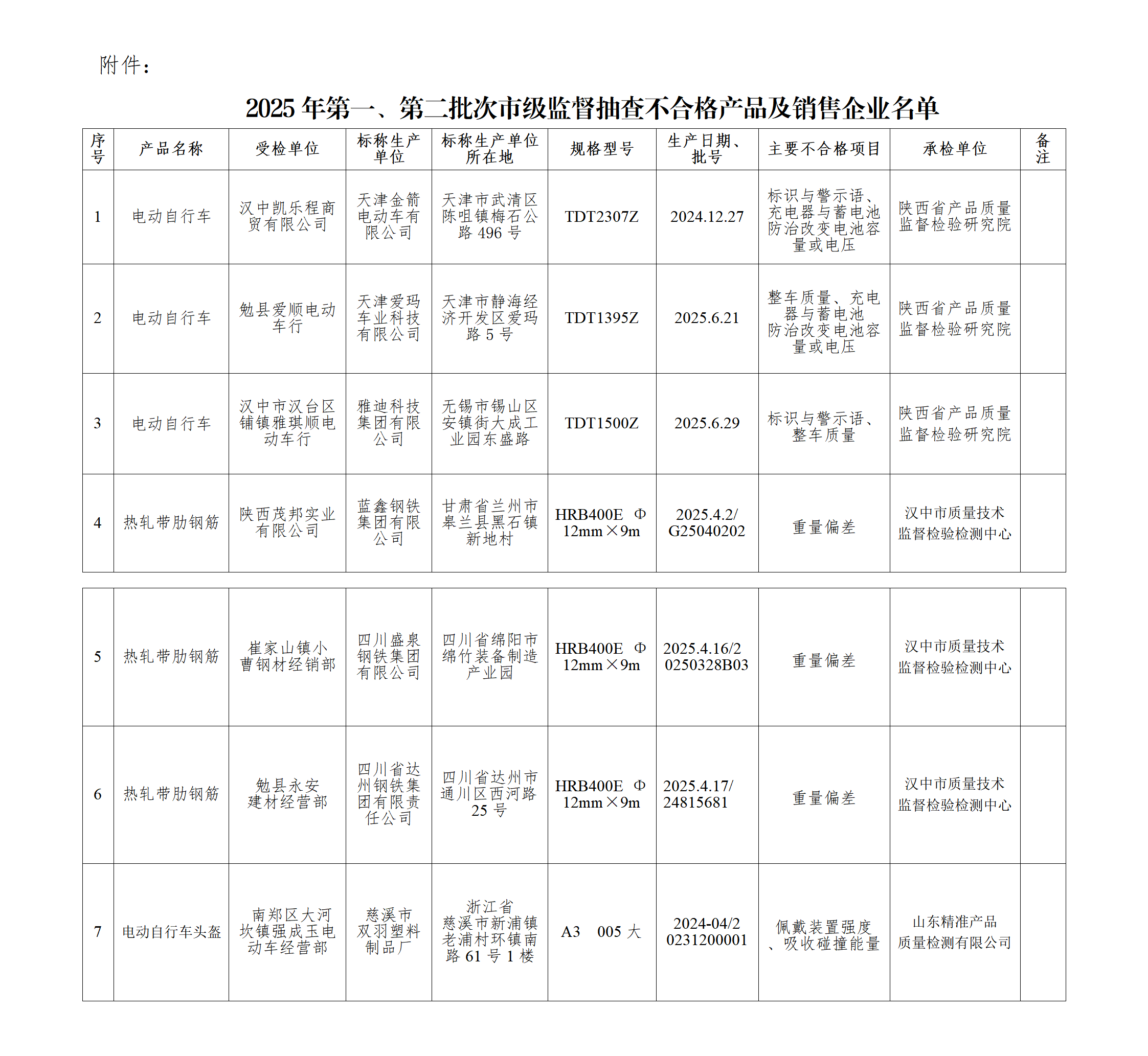 汉中市2025年第一、二批次市级产品质量监督抽查不合格产品及生产销售企业名单。