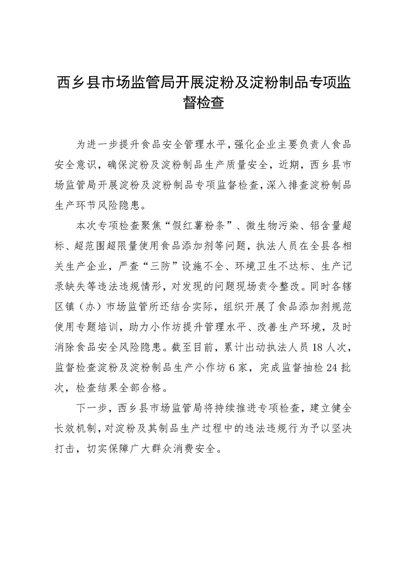 西乡县局开展淀粉及淀粉制品生产企业全覆盖监督检查